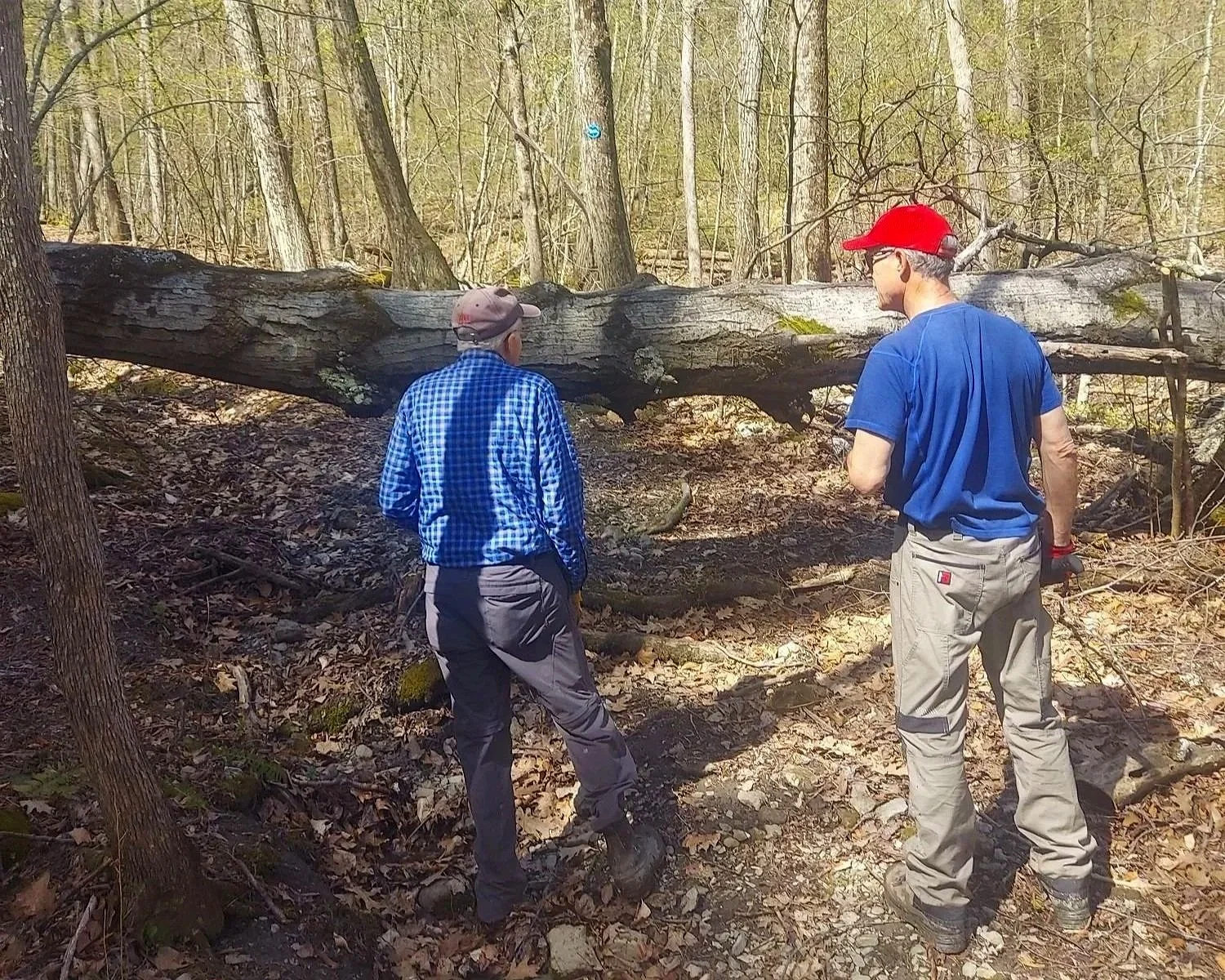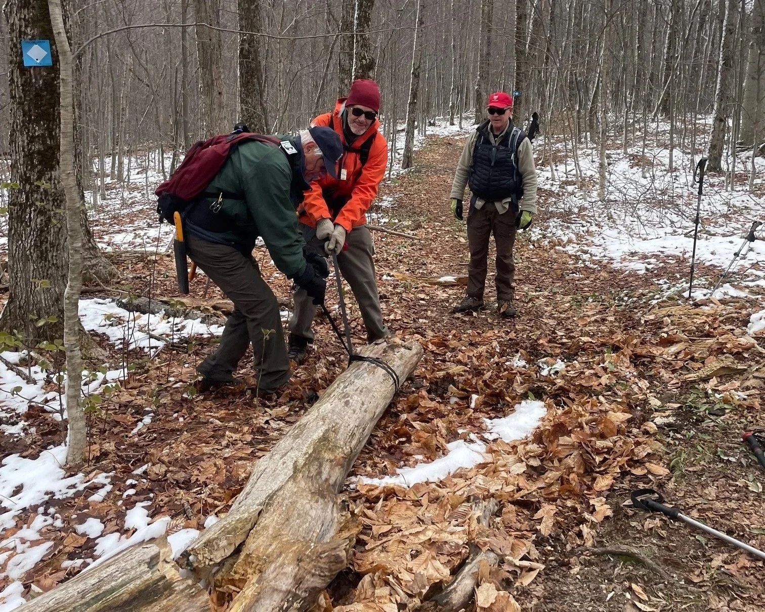 Our trail work crew assessing how to safely remove the tree trunk. Pic by M Boucher